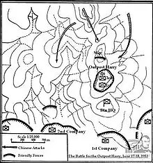 A Company of the 5th RCT and L Company of the 15th Infantry Regiment defended Harry. They were supported by a detachment from the 10th Combat Engineer Battalion that got trapped on the outpost while on a mine laying detail.[8] At 22:00 on 12 June 12, PVA artillery and mortar fire preceded an attack on the outpost which was broken up by UN defensive fires. The PVA were in the trench for a short time but were forced to withdraw. Fighting ceased at 22:47. However at 02:08 the PVA attacked from the north, northeast, and northwest of the outpost.[9] Bitter hand-to-hand fighting ensued as the PVA gained the trench on the northern slope of the outpost. Company L, 15th Infantry, reinforced, and by 04:50 the PVA were driven from the trenches and forced to withdraw. A platoon of tanks from the 64th Tank Battalion plus one platoon of infantry were dispatched to the valley east of Outpost Harry and operated successfully as a diversionary force. All action ceased with the exception of UN counter-battery and counter-mortar fire.