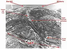 Outpost Harry's elevation was around 1,280 feet (390 m) and positioned some 320 yards (290 m) south of a larger landmass occupied by the PVA called "Star Hill" and some 425 yards (389 m) northeast of UN positions. A service road that wound from the Main Line of Resistance (MLR) along an intermittent stream led to the rear of the outpost where a medical aid station and a supply point were located. Harry was an outpost east of the Chorwon Valley with sister outposts to the west called Tom and Dick. Outpost Dick was about 100 yards (91 m) in front of the MLR, and Tom was about 250–300 yards (230–270 m) in front and below the MLR. The latter was the floor of the valley. Harry, which was over 400 yards (370 m) from the MLR, was also higher than the MLR, making supply much more difficult. The route to the outpost was under constant PVA observation and fire, and its height made it harder to pack supplies up the hill. Unlike Tom and Dick, which could get supporting fire from the MLR, Harry got less close supporting fire from the MLR because company 60mm mortars and the heavy machine guns did not have enough range. Harry relied more on artillery and heavy mortar companies.
