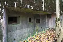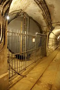 Fermont comprises two entrance blocks, three infantry blocks, three artillery blocks, and one observation block. The combat blocks are connected to the entries and support areas by a gallery system extending over 1,000 metres (3,300 ft) from end to end.[3] The munitions and personnel entries are located far to the rear of the compactly arranged combat blocks, with the entries hidden in the woods. Both entry blocks required elevators to reach the level of the gallery, as the preferred inclined or level tunnel could not be achieved in the local topography.[4] A partial "M1" ammunition magazine is located just inside the ammunition entry, while the underground barracks are located near the junction of the two entry galleries. From there a long, straight gallery runs at an average depth of 30 metres (98 ft) to the combat blocks. Fermont was served by a 60 cm-gauge narrow-gauge railway, which enters at the munitions entrance and runs all the way out through the galleries to the combat blocks. On the surface, the railway connects to supply points to the rear and to other ouvrages.