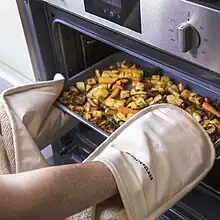 An oven glove, also commonly known as an oven mitt, is a thermal insulated glove or mitten usually worn in the kitchen to easily protect the wearer's hand from hot objects such as ovens, stoves, cookware, etc.[1][2] They are functionally similar to pot-holders, but designed to be worn over one's entire hand.