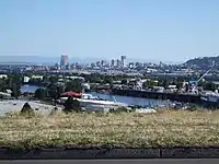 The neighborhood includes Swan Island, originally an island in the Willamette. In 1899, Richard McCrary, James Connor, and Hi Straight set up a moonshine still on Swan Island.[3] The island was connected to the east bank by landfill in the 1920s. Swan Island was the site of Portland's first airport, Swan Island Municipal Airport, dedicated by Charles Lindbergh in 1927[4] and operating until the early 1940s when the island was converted to naval shipbuilding use for World War II as one of the Kaiser Shipyards.[5] Swan Island is now an industrial area.