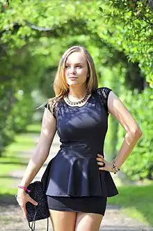 An overskirt is a type of women's short skirt which is draped over another garment, such as a skirt, breeches, or trousers. Although peplum is often used as another term for overskirt, it should not be confused with the peplos or "peplum dress", which was worn in ancient Greece.
