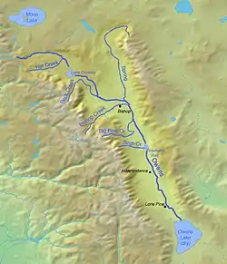 The Owens River course begins (top left) as Deadman Creek, and the river designation begins where the Big Springs tributary enters the Deadman Creek channel.[1]:89,108,113