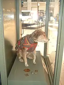 Owney is the subject of an exhibit at the Smithsonian Museum.[14][18] He was sent there in 1911, and has been called one of the museum's "most interesting" artifacts.[upper-alpha 1][16] His remains deteriorated over the intervening century, and were (along with associated artifacts) given an extensive makeover in 2011.[19][upper-alpha 2] One of the Smithsonian's employees opined the makeover a success, and called its culmination "the big reveal".[20]