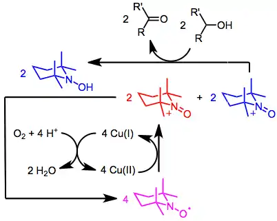 One-electron oxidants, such as copper(II), operate via a more complex mechanism involving dioxygen as the terminal oxidant.[8] Copper(II) oxidizes four equivalents of nitroxide to oxoammonium, two equivalents of which (blue) react with alcohols to form carbonyl compounds. The other two equivalents of oxoammonium (red) undergo comproportionation to re-form nitroxy radicals (pink). Finally, dioxygen re-oxidizes four equivalents of copper(I) back to copper(II). Overall, a single molecule of dioxygen mediates the oxidation of two equivalents of alcohol, with the formation of two equivalents of water.