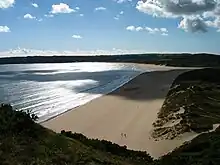 A wetland site at the rear of the dunes forms Oxwich Burrows National Nature Reserve.[3] The dunes are crossed by a small stream called Nicholaston Pill.[4] The bay ends at the eastern end with the cliffs of High Tor; but at low tide, a continuous sandy beach connects with Three Cliffs Bay beyond.[5] Within the nature reserve there are rare plants such as the dune gentian and the round-leafed wintergreen, insects such as the small blue, beachcomber beetle and the hairy dragonfly while the wetlands are important for birds, a bird hide is located at Whitestones which is accessed by a boardwalk through the wetlands. The birds present include water rail, little grebe and wildfowl, as well as the occasional wintering great bittern.[3]
