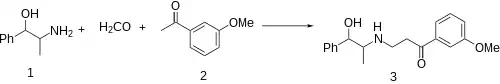 Mannich condensation of PPA [14838-15-4] (1) with formaldehyde and m-acetanisole (3-Acetylanisole) [586-37-8] (2) yields oxyfedrine (3).