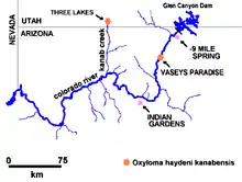 14. Stevens, L.E., V.J. Meretsky, D.M. Kubly, J.C. Nagy, C. Nelson, J.R. Petterson, F.R. Protiva, and J.A. Sorensen. 1997b. The impacts of an experimental flood from Glen Canyon Dam on the endangered Kanab Ambersnail at Vaseys Paradise, Grand Canyon, Arizona: Final Report. Grand Canyon Monitoring and Research Center, Flagstaff. Archived 2006-10-04 at the Wayback Machine