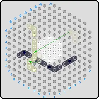 The objective of the game is to build a contiguous path using playable pieces in the player's color that spans opposite sides: column A to column Q, or row 1 to row 17, or the side (J2 ... P8) to (B10 ... H16).[1] Pieces with cells that are adjacent to each other are considered contiguous, even if they are on different levels.