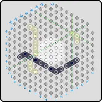 The game is played on a clipped regular hexagonal board with 9 spaces on a side; the 6 corners are removed, resulting in 211 spaces. The first play is restricted from playing a piece in the central 3×3 hexagonal region.[1]