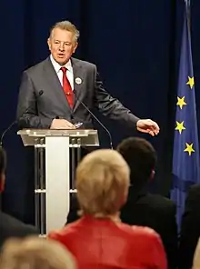 Schmitt was a successful fencer in his youth, winning two gold medals at the Summer Olympic Games.[9] Later, he served as an ambassador during the 1990s, and he was a Member of the European Parliament with the Fidesz party from 2004 to 2010.[9] After briefly serving as Speaker of the National Assembly of Hungary in 2010,[9] Schmitt was elected as President of Hungary in a 263 to 59 vote in the Parliament of Hungary; he was sworn in as President on 6 August 2010.[10]