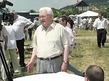 In January 1994, Boross met with leaders of the Central-European post-communist countries in Prague, reflecting the 1994 Brussels summit where the United States expressed its intention to enlarge the NATO intergovernmental military alliance. Before the 1994 election, Viktor Chernomyrdin, the Prime Minister of Russia visited Budapest to discuss the issue of debt settlement. Boross also asked Chernomyrdin to talk with Slobodan Milošević for the interests of the Hungarians in Serbia during the Yugoslav Wars.[31] In February 1994, Boross visited France where he held talks with President François Mitterrand and Prime Minister Édouard Balladur.[32] In March 1994, he visited German Chancellor Helmut Kohl in Bonn.[33]