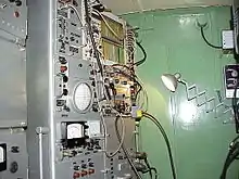 The P-18 uses a single antenna accomplishing both transmission and reception. The antenna is composed of sixteen Yagi antennas mounted in sets of eight with one set above the other. The radar antenna is mounted on the truck used to transport it improving mobility and the radar also features a mechanism which allows the antenna height and elevation to be altered during operation.[1] Azimuth is scanned mechanically by the antenna with a rotation of 10 r.p.m, the original P-18 used three indicators, including two plan position indicators in addition to a back-up A-scope.[5] Like the P-12 the radar features automatic frequency control with four pre-set operating frequencies, moving target indicator to eliminate passive clutter and active jamming, the radar could also display tracks from another radar it was paired with. The original P-18 used a coaxial cavity resonator transmitter, vacuum tube receiver with transistor based preamplifier and a vacuum tube/pin diode based duplexer.[5] A secondary radar for IFF is generally used in conjunction with the P-18, either the NRS-12 or the later 1L22 "Parol".