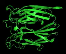 PNGase F requires a minimum of two GlcNAc oligosaccharide residues attached to the asparagine in order for catalysis to occur.[12] This enzyme utilizes a catalytic triad of cysteine-histidine-aspartate in its active site, which is a common motif for amidases. This motif contains a nucleophile, a proton donor, and a positive charge to stabilize the tetrahedral intermediate. The crystal structure of PNGase F from flavobacterium miningosepticum, with 1.8 Å resolution, was found to be folded in two domains, each with an eight-stranded antiparallel β barrel, or jelly roll, configuration. This structure is similar to lectins and glucanases, suggesting similarities with lectins and other carbohydrate-binding proteins.[3]