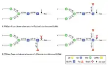 Other endoglycosidases, similar to PNGase F, include endoglycosidase F1, endoglycosidase F2, endoglycosidase F3, and endoglycosidase H.[6][7][8] These endoglycosidases have more specificity in cleavage and are less sensitive to protein conformation than PNGase F.[1][9][10] All of these endoglycosidases, including PNGase F, can be purified from an almond emulsion or flavobacterium meningosepticum.[1][6][10][11][12]