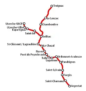 - From Tulle, north to Uzerche and a connection with the standard gauge PO (later SNCF) lines,