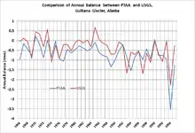 The mass balance, runoff and surges of Bering Glacier were calculated with the PTAAGMB model using weather observations at Cordova and Yakutat, Alaska. Ice volume loss measured with the PTAAGMB model agrees within 0.8% of the loss measured with the geodetic method. Runoff from Bering Glacier (derived from simulated ablation and rain) correlates with four of the glacier surges that have occurred since 1951.[5]