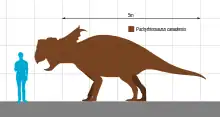 Size estimates for the largest Pachyrhinosaurus species, P. canadensis indicate lengths of 6–8 metres (19.7–26.2 ft) and a weight of 3–3.6 tonnes (3.3–4.0 tons).[10][11][12] The other species, P. lakustai and P. perotorum, have been estimated by Greg Paul at 5 metres (16.4 ft) in length and 2 tonnes (2.2 tons) in weight.[11] They were herbivorous and possessed strong cheek teeth to help them chew tough, fibrous plants.