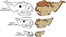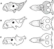 Instead of horns, their skulls bore massive, flattened bosses; a large boss over the nose and a smaller one over the eyes. A prominent pair of horns grew from the frill and extended upwards. The skull also bore several smaller horns or ornaments that varied between individuals and between species. In P. canadensis and P. perotorum, the bosses over the nose and eyes nearly grew together, and were separated only by a narrow groove. In P. lakustai, the two bosses were separated by a wide gap. In P. canadensis and P. lakustai, the frill bore two additional small, curved, backward-pointed horns.[3] P. perotorum was thought to have two unique, flattened horns which projected forward and down from the top edge of the frill, but 2019 it was shown that these had been inaccurately reconstructed and it instead had the same backward pointed as its sister species.[13]