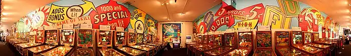 The museum's exhibitions include approximately ninety playable pinball machines and additional static display pins ranging in age from 1879 until modern day.[7] They are arranged in chronological order in the museums rooms.[5] In total, the museums collection comprises over 1,100 unique machines. Those not on display are maintained at the 8,000-square-foot Pacific Pinball Annex nearby.[3] Upon paying the admission fee, visitors can play any of the machines on display for the day with unlimited in and out privilege's to take breaks and get food nearby.[7][8] The oldest machine on display, from 1879, is a Montague Redgrave Parlor Bagatelle. One of the special games housed (and playable) in the museum is Gottlieb's "Humpty Dumpty" from 1947, the first game with flippers.[9] Contemporary machines include The Addams Family and the Twilight Zone. The museum also has a transparent pinball machine from 1976 that was built by Schiess and Wade Krause. It is based on the Gottlieb "Surf Champ" game.[10] One of the most valued pieces in the collection is a mid 1930s-era Art Deco machine called the Bally Bumper. The machine was seized by police in Oakland during a gambling crackdown. The museum's collection has also been displayed at San Francisco International Airport.[5]