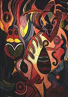 Abad developed a technique of trapunto painting (named after a quilting technique), which entailed stitching and stuffing her painted canvases to give them a three-dimensional, sculptural effect. She then began incorporating into the surface of her paintings materials such as traditional cloth, mirrors, beads, shells, plastic buttons and other objects