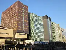 The original plan for the eastern end envisaged a commercial development focused around the Grand Union Basin and included the Winding building and the Grand Union building.[27] The Richard Rogers Partnership originally designed the latter as three towers of 24, 32 and 40 floors rising to 164m, but the planners imposed a height limit of 100 metres (330 ft).[28] The revised scheme comprised six linked blocks of 30 storeys totalling 860,000 sq ft (80,000 m2) of mixed-use space,[28] but the project was discarded when it looked like the site would be needed by the Health Campus (see below).[29]