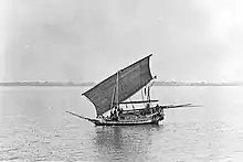 It typically weights between 20 and 50 tons, had one or two tripod masts with "lateen" (tanja) sails made of mat. Like other traditional vessels of the archipelago, it is steered using two quarter rudders.[3]: 184 [4] Between the end of the 16th century to early 20th century they routinely sailed for the coasts of northern Australia in search of teripang (sea cucumbers), armed with cannon of ancient origin, probably cetbang or lantaka. Padewakang were the biggest craft of South Sulawesi as trading vessel and as war fleets, used for hundreds of years sailing the seas between western New Guinea, the southern parts of the Philippines, and the Malay Peninsula. There is even a British publication of padewakang under full sail in the Persian Gulf.[5]: 134–137 They are used until the production stopped in favor of the famous Palari by the 20th century. The palari evolved from basic padewakang hull with fore-and-aft sails to its own hull model with indigenous "pinisi rig".[6]: 41–42 H. Warington Smyth described a large 2-masted padewakang built of giam wood. The dimension is as follows: 99 ft (30.2 m) long, 15 ft (4.6 m) wide, 12 ft (3.7 m) depth, 6 ft 3 inch (1.91 m) freeboard. The capacity was 60 koyan (145 metric tons), with 60 ft (18.3 m) mainmast, crewed by 16 men.[7]: 580