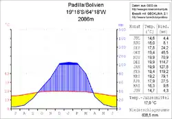 Padilla is located in the transition zone between the Andean mountain range, the Cordillera Central and the Bolivian lowlands at an altitude of 2086 metres. The mean average temperature of the region is around 18 °C and varies only slightly between 14.5 °C in June and July and nearly 20 °C from November to January.[8] The annual rainfall is about 650 mm, with a pronounced dry season from May to August.