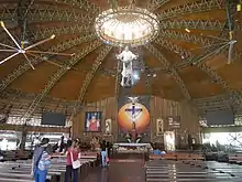 The structure of the main church is made mostly of indigenous materials such as wood, stone, bamboo, sasa or nipa leaves and sawali or woven bamboo strips. The shape of its roof resembles a salakot, a traditional Filipino hat used by farmers and fishermen in their respective agricultural activities as their protection against the heat and rain.[3] At the top of the roof stands the image of Our Lady of Mercy. The structure is open so that the pilgrims can enter and exit freely.