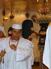 A pai-de-santo or pai de santo (Portuguese pronunciation: [ˈpaj dʒi ˈsɐ̃tu]) is a male priest of Umbanda, Candomblé and Quimbanda, the Afro-Brazilian religions. In Portuguese those words translate as "father of [the] saint[s]", which is an adaption from the Yoruba language word babalorishá, a title given to the African religion's priests. Babá means father, and the contraction l'Orishá means "of Orishá". As a product of the syncretism, the word Orishá (elevated or ancestral spirit) was adapted into Portuguese as saint.[1]