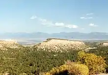 The Pajarito Plateau is a volcanic plateau in north central New Mexico, United States. The plateau, part of the Jemez Mountains, is bounded on the west by the Sierra de los Valles, the range forming the east rim of the Valles Caldera, and on the east by the Puye escarpment, which rises about 300 to 400 feet (90 to 100 m) above the Rio Grande valley about a mile (1.6 km) west of the river. The Rio Grande passes through White Rock Canyon to the southeast, and the Caja del Rio (Cerros del Rio) across the river is sometimes regarded as part of the plateau.[1] The plateau is occupied by several notable entities, including Bandelier National Monument, the town of Los Alamos and its remote suburb White Rock, and Los Alamos National Laboratory. Elevations range from about 5,600 feet (1,700 meters) at the river to about 7,800 feet (2,400 meters) where the plateau merges into the mountain range.