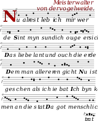 The earliest source for the melody is the Münster fragment (ms. Z), written about a century after Walther's death.[5] The Carmina Burana ms. (c. 1230) contains the first stanza of Palästinalied (CB 211a) with neumes, which are however insufficient for reconstructing a melody. The stanza is given as an appendix to Alte clamat Epicurus (CB 211), which was to be sung in the same melody.