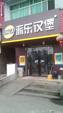 Pala Catering Management Co Ltd, doing business as Pala Hamburger (simplified Chinese: 派乐汉堡; traditional Chinese: 派樂漢堡; pinyin: Pàilè Hànbǎo), is a Chinese fast food chain headquartered in the Wuhan CBD (武汉中央商务区).[1] The first store opened in Wuhan in 1999. Ke Zhaoyan, the marketing manager, stated that Pala opened in smaller cities and towns because its food is cheaper compared to that of Western-owned companies. In 2012 the company had about 1,000 franchised stores and about 400 direct sale stores with plans to open an additional 460 stores.[2] The number of stores grew to 1,700 in 2012, and 2013 to 1,850. In 2014 China Daily ranked Pala as No. 6 of the " Top 10 fast-food chains in China".[3]