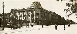 The three-story building in Rostov-on-Don at the corner of present-day Budennovsky Avenue and Pushkinskaya Street was built in the 1880s for the needs of Kushnaryov Tobacco Factory. In 1914 the "Ya. S. Kushnaryov Partnership" together with Aslanidi Tobacco Factory joins merged with Asmolov Tobacco Factory Enterprise, and so the building on Budennovsky Avenue was rebuilt in 1914-1915 in the Empire architectural style on the project of the Armenian architect Arutyun Khristoforovich Zakiev.[1]