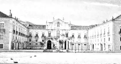 There are records showing the existence of residences in this location, since the 16th century, and that at the end of the century, the family of Gomes de Elvas rented the Quinta da Mata from the monastery of Odivelas.[1] A Jewish family, uncommon for the time, in 1606 King Philip III of Spain bestowed Luís Gomes de Elvas Coronel a noble title, in gratitude for his services to the Crown (during the Iberian Union). At the same time, the monarch altered his surname to in conformity to New Christian requirements, to Gomes da Mata.[1][2][3] Simultaneously, he conferred on the nobleman the title of High-Courier (or Postmaster General), which consolidated his importance to the Kingdom's commercial or financial sectors. In this epoch, the buildings of the estate, corresponding to the southern wing were simple structures, until the beginning of the 18th century.[4]