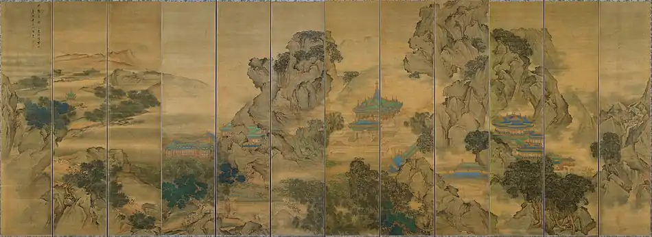 The palace was built for Emperor Taizong as a renovation of the earlier Renshou palace built for the Emperor Wen of Sui. The project was ordered in the fifth year of his reign (631) and the emperor visited each year in the summer. In the second summer (632), he discovered a spring which was dug out and found to provide sweet water. A stele was erected to record this with an inscription composed by chancellor Wei Zheng and carved by the imperial calligrapher, Ouyang Xun. This is a famous example of his calligraphy and rubbings are now held by several museums.[2] The palace is also the subject of paintings and music such as "The Palace of Nine Perfections" by Eric Ewazen.