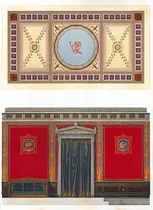 The upper floor contained the sleeping accommodation, lavatories, bathrooms, dressing rooms and children's rooms for the large Strousberg family. The central hot water system, a feature which only a handful of buildings in Berlin in the late 1860s possessed,[lower-alpha 3] was an indication of the building's modernity. Examples of the luxurious, but classically inspired interior decoration can be seen in the designs for the bathroom, where Roman Pompeii style wall paintings graced the walls (right). The more senior domestic staff – the nanny and governess – were also housed on the upper floor.