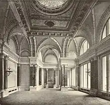 Visitors would ascend the stairs, walk through the portal in the Portico and arrive in a vestibule which extended vertically for two storeys and was lit by a skylight in a coffered, oval domed ceiling. At night time the space was illuminated with gas lights with movable shades. The two flights of marble stairs united at a landing over which was a half dome. From there the stairs extended to running on both sides of the upper floor. The stair's balusters were of biscuit porcelain. The reception room to the left of the vestibule, extended the length of all five windows of the south wing and led to the ballroom, an octagonal room with four rounded niches in the corners. A skylight illuminated the windowless room with a similar gas lamp as the vestibule, providing nighttime lighting. The panelled north wall could be folded down into the adjoining lightwell such that it spanned the well. Again with a glass roof, the additional space was used to provide accommodation for musicians or other performers. The connecting drawing room linked the ballroom via a further anteroom, the former conservatory, with the great hall. This opulent room was built after the British bought the embassy. They employed August Orth to convert the old garden terrace on the west side of the building into a sumptuous state room. Paired marble corinthian pilasters and columns lined the walls and punctuated the glazing to the central courtyard and vaults rose over an entablature to support a flat ceiling decorated with rich ornamental carvings and painting. In 1877 the Berlin sculptor Otto Lessing created two stucco reliefs featuring dancing Maenads as part of the wall decoration for the great hall.[13] Once again the lighting was provided by gas lamps with mobile shades integrated into the oval skylight, which simultaneously allowed ventilation.
