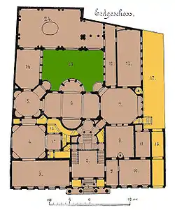 Ground floor plan: After the 1884 alterations. 1 Entrance 2 Vestibule 3 Reception room 4 Ballroom 5 Drawing room 6 Dining room 7 Billiards room 8 Library 9 Antechamber 10 Ambassadors work room11 Bedroom 12 Art gallery 14 Antechamber 16 Passage 17 Courtyard with glazed roof 18 Buffet room 23 Courtyard 24 Great hall |