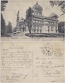 Vaissier dreamed of building for himself a residence that reflected his high aspirations, his economic status and future ambitions. He no longer would live between the blackened walls of his factory on the rue de Mouvaux in Roubaix, and instead planned to move to a plot of land located at the exact same address (2, rue de Mouvaux) in neighboring Tourcoing.[4] The plot of land on which the house sat is so close to the municipal boundaries between the two cities that postcards depicting the Palais Vaissier in the early twentieth century frequently situated it in either municipality, as well as varying their identification of the structure as the "Château Vaisser," "Château du Congo," "Château de M. Victor Vaissier," and "Château des Princes du Congo" being the most popular.[5][6]