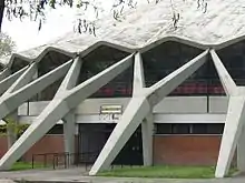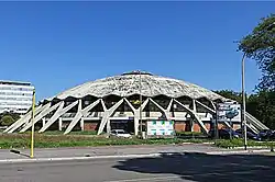 The arena is constructed with a ribbed concrete shell dome, that is 61 meters in diameter, and is constructed of 1,620 prefabricated concrete pieces,[3] which are braced by concrete flying buttresses. Much of the structure was prefabricated, so that the dome was erected in 40 days.[6]