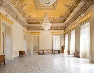 The Hall of Honor, which is located on the first floor, has access to the loggia that faces the Arena Civica.[10] At the entrance of the Hall of Honor there are paved mosaics with classic motif, rosettes, meandering bands, and layered surfaces, designed by Luigi Canonica and inspired by strict Classicalism. At the central entrance, which was designed by the house of C. Fabricio as evidenced by the signature, the central rosette, which once decorated the entrance, was replaced in 1928 with the coat of arms of Milan, which was granted jurisdiction over the entire arena in 1870.[3] The creators' names of the mosaics are readable between the mosaic tiles, including the firms Fabricio and D.Fantini-Figli, founder of Fantini Mosaici. The latter also worked on other buildings close to the Palazzina in the 1830s. The mosaic shows differences from the original project and it has recently been subjected to a major conservative restoration on its entire surface where grafts of new plugs and mortars to fill the damaged plugs are visible.
