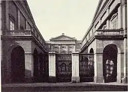 The palazzo was constructed in 1828 by Francesco Teodoro Arese Lucini, designed by Pelagio Pelagi.[1] The home was built in the centre of Milan, on the large garden of the monastery of Sant Agostino Neri.[2] After the death of count Arese the palazzo was sold to the Hungarian Bethlen family. Because of its central location and vast gardens, the building and grounds were eventually subdivided and sold to developers. When the Bethlen family abandoned the palazzo, it was divided into smaller apartments until it was demolished by developers following damage sustained in the bombing of Milan in World War II, even if this only damaged the central part of the construction and not its wings.[3]