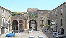 After the devastations of the 1693 Sicily earthquake, the Prince of Biscari, Ignazio Paternò Castello, 3rd Prince of Biscari, obtained the permission to build this palace. At the time the building stood against the French king Charles V's walls of the town. After Ignazio's death in 1699, his son Vincenzo (1685-1749) and later his nephew Ignazio Paternò Castello (1714-1786), the fifth Prince of Biscari extended and completed the decoration. This latter prince complimented the work with a museum space to display his large collection of mainly archeologic and numismatic collections, now on display in the Museo Civico Castello Ursino.[1]