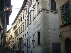 The portal (later transformed) is attributed to Bartolomeo Ammannati, but has no relation[2] with the 18th-century relief by Ferdinando Ruggieri that refers to the Palazzo del Cavalier Vernaccia, at the time owner and united to the Caccini by marriage ties. Restoration of the façade in 2022 revealed that the portal of house no. 31 is in the Ammannatesque style, and that the drawing[3] of the portal of house no. 33 is attributable to Pasqui, when he redesigned the façade. The façade, with its slightly broken lines, organised on three floors plus a mezzanine for no less than thirteen axes, is the result of restoration work carried out by the architect Leopoldo Pasqui around 1843, as attested by Federico Fantozzi.