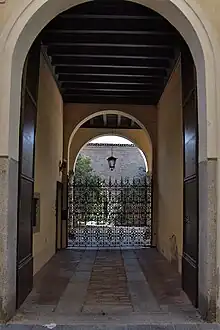 The entrance hall has flooring in terracotta tiles with trottatoie and wooden ceiling; along the right wall is, curiously enough, a millstone walled in; the entrance leads to a portico with three forts with round arches and columns of Ionic order resting on stone plinths.[1] Three windows[1] rest on the stringcourse cornice.