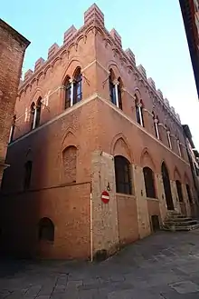 The Palazzo Marsili is a Gothic style urban palace localized on Via di Città #124-132, in the Terzo di Città, in the city of Siena, region of Tuscany, Italy. adjacent on Via di Città to the shorter brick Palazzo Marsili-Libelli with plain rectangular second and third story windows.