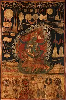 Palden Lhamo appears in the retinue of the Obstacle-Removing Mahakala, either as an independent figure[1] or associated to Ekajati,[6] and has been described as "the tutelary deity of Tibet and its government",[7] and as "celebrated all over Tibet and Mongolia, and the potent protector of the Dalai and Panchen Lamas and Lhasa."[8]