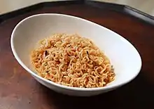 Paldo Bibim Men is a brand of brothless ramyeon (ramen) with sweet and spicy seasoning sauce to mix with noodles, produced by Korea Yakult PalDo (팔도) since 1984. It is the oldest brothless ramyeon in Korea.[1] In 2013, Paldo Bibim Men was the tenth-ranked for ramyeon sales in South Korea, with revenues of 47 billion won that year.[2][3] Paldo Bibim noodles are cooked in hot water, rinsed in cold water and mixed with the sauce.