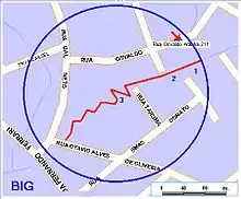 The circled area comprises 9 hectares and is crossed by the stream (arroyo) Cancela starting at Osvaldo Aranha Street and flowing toward Fernando Ferrari Avenue. Along this stretch Triassic vertebrate fossils are found within the exposed red sediments. The main collection points are listed as 1, 2 and 3 in Figure 2. The distance from point 1 to point 3 is 185 meters, whereas the distance from point 3 to Otavio Alves de Oliveira Street is 142 meters.